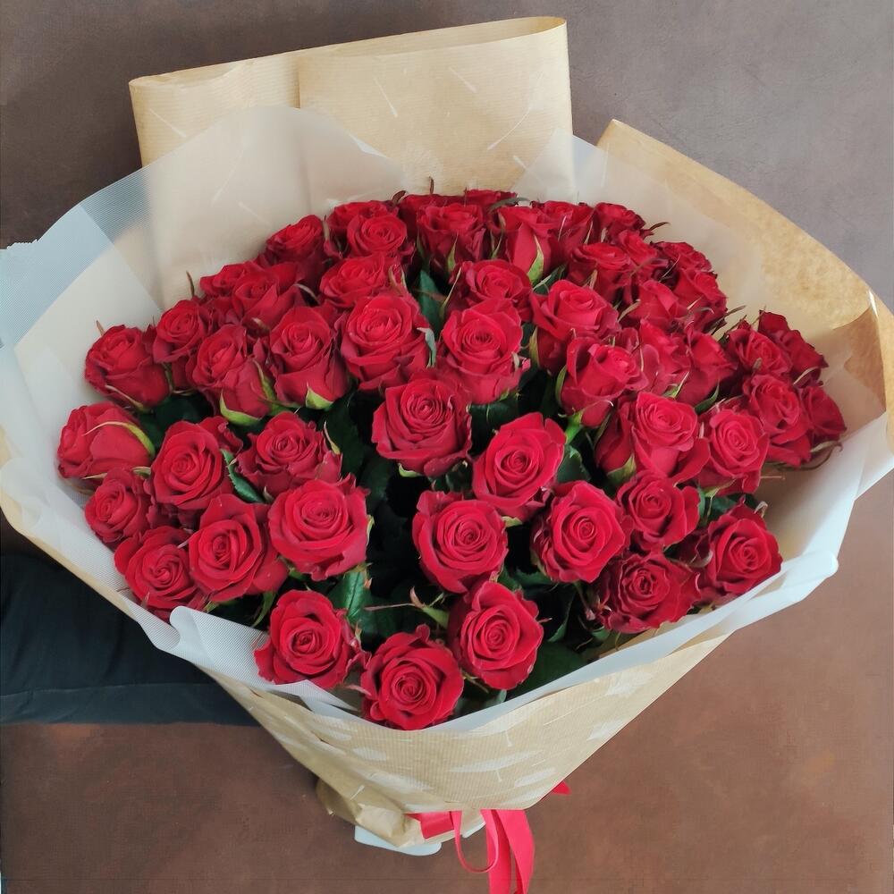 Красивый букет из 51й красной розы, оформленный в кальку и бумагу.