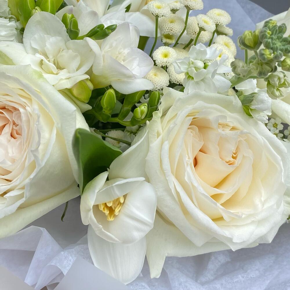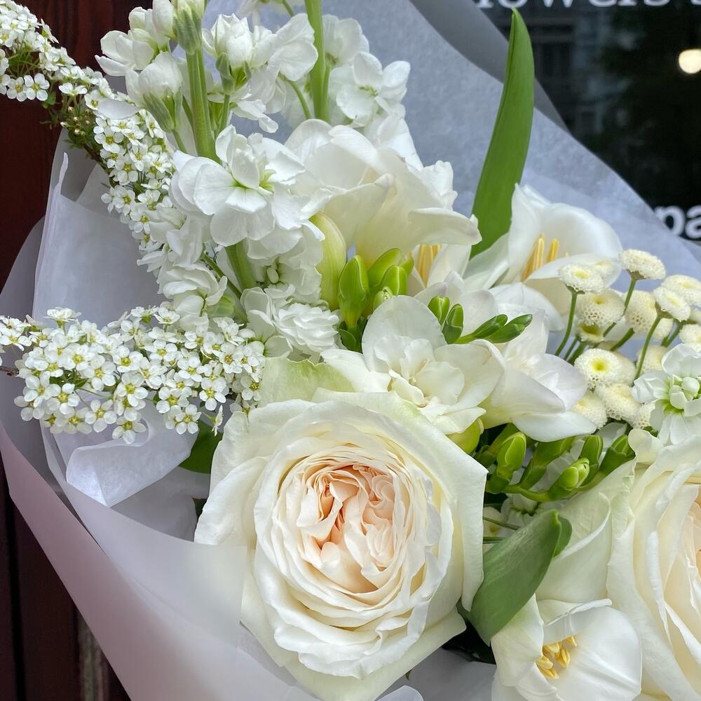 Лента атласная - 1 шт.Фрезия белая - 2 шт.Упаковка дизайнерская - 3 шт.Маттиола белая - 3 шт.тюльпан белый голландия - 3 шт.роза white o'hara - 3 шт.спирея ветви - 3 шт.